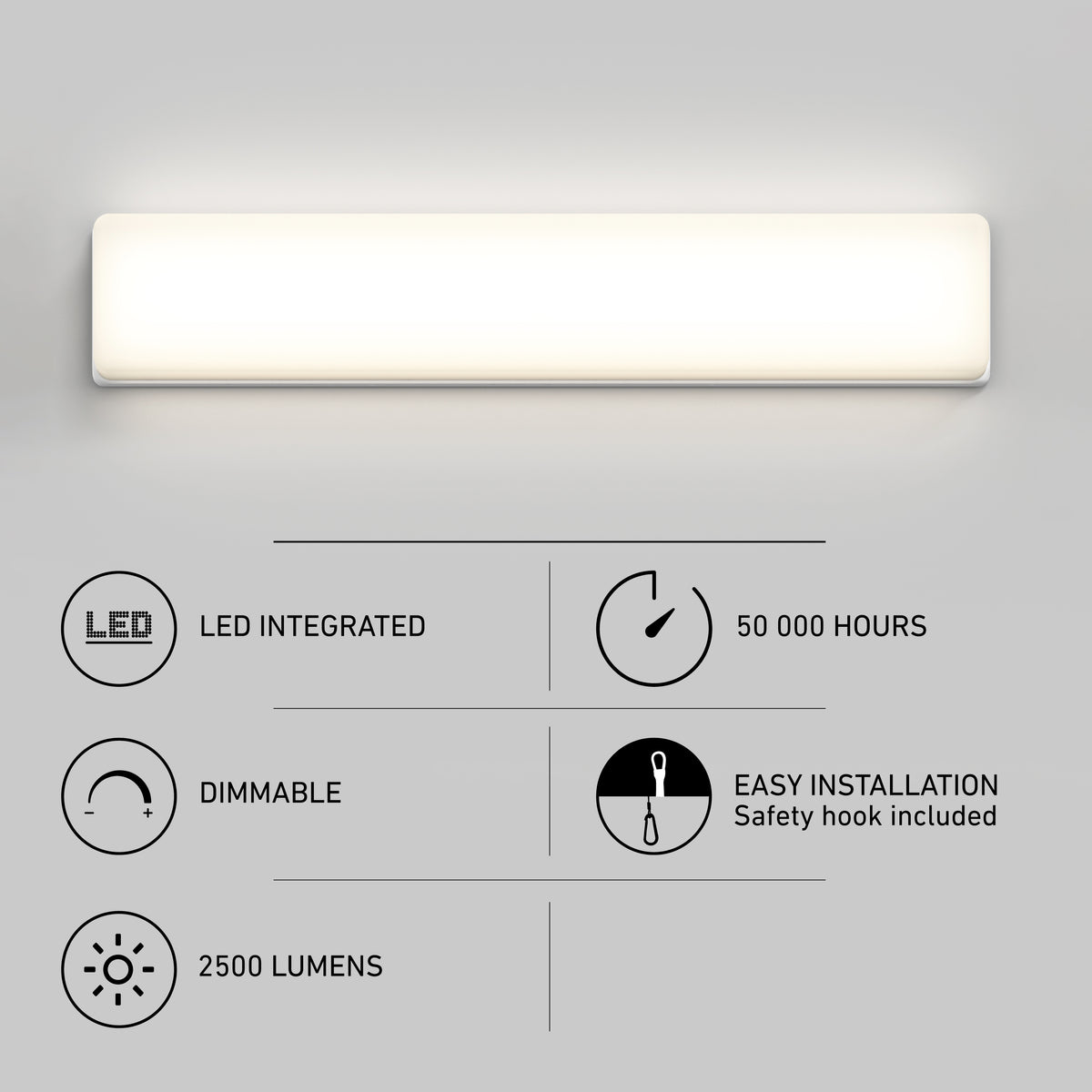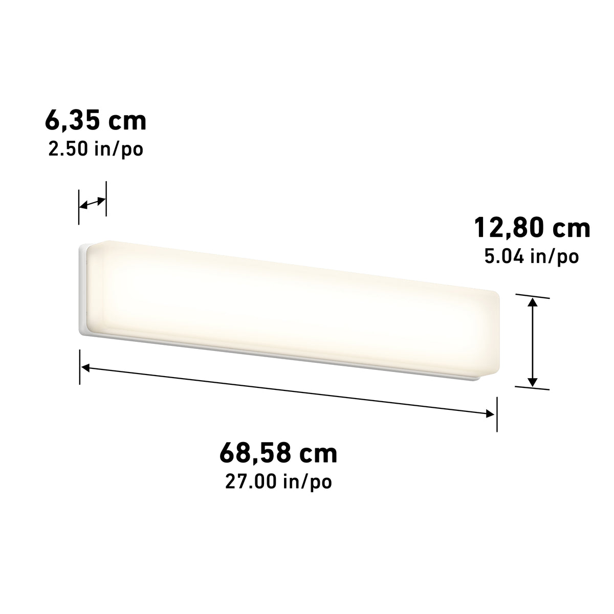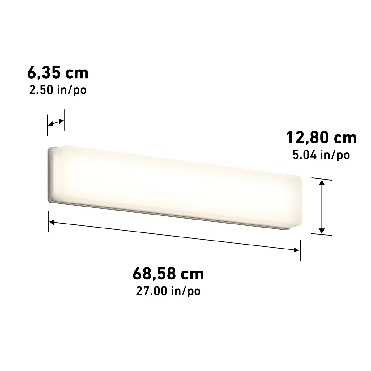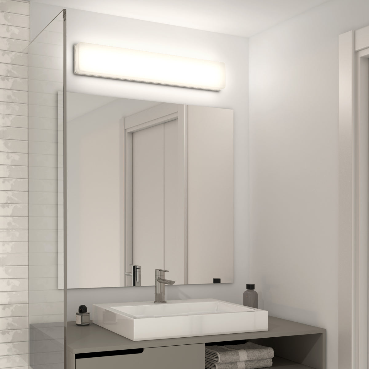 Cette applique murale puissante à DEL intégrée prendra fièrement place au-dessus du miroir de la salle de bain ou de la salle d’eau afin d’offrir un éclairage abondant et flatteur au niveau du visage, facilitant la mise en beauté. Sa forme rectangulaire lui confère un aspect moderne, mais qui conviendra aussi à d’autres styles de décors. D’une puissance totale de 2800 lumens, cette applique peut également se tamiser à l’aide d’un gradateur à DEL compatible afin d’inciter à la détente. Son blanc doux n’est ni trop bleu ni trop orangé. Conforme à la norme JA8-2019; durée de vie : 50 000 heures.