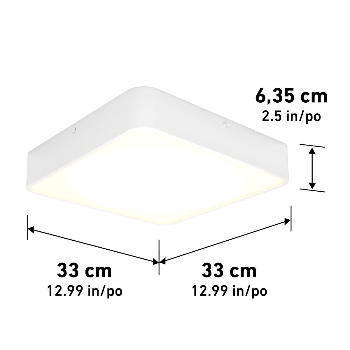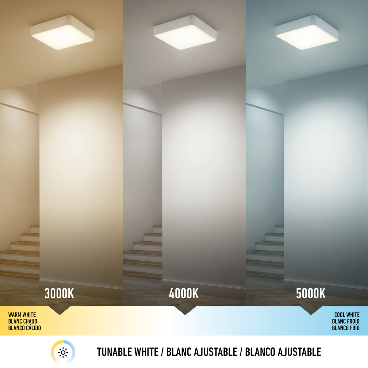 Au plafond des chambres à coucher, des bureaux, des salles de bains, des passages et du garage, ce plafonnier à DEL intégrée offre une lumière vive et uniforme, facilitant les activités quotidiennes. Son fini blanc mat lui permet de se fondre aux peintures pâles, tandis que sa forme carrée et ses coins arrondis créent un joli relief délicat. Trois teintes de blancs sont disponibles à même ce plafonnier, afin de vous laisser sélectionner celle qui convient le mieux à vos besoins. Avec ses 1400 lumens, il est assez puissant pour éclairer à lui seul une pièce de petite ou moyenne dimension (possibilité de le coupler avec un gradateur à DEL). Durée de vie : 50 000 heures.