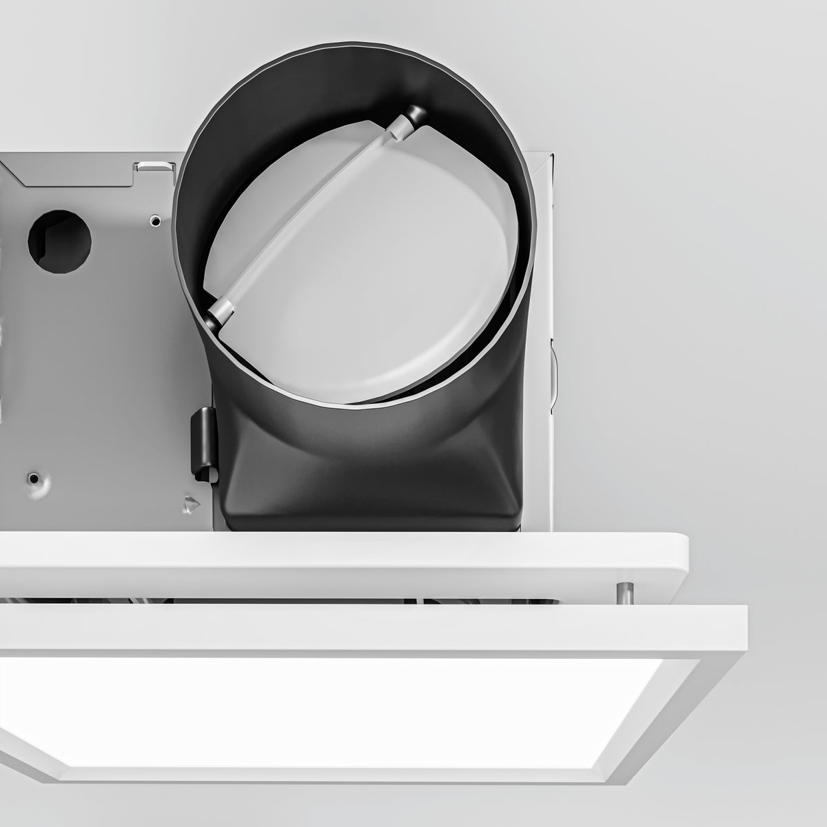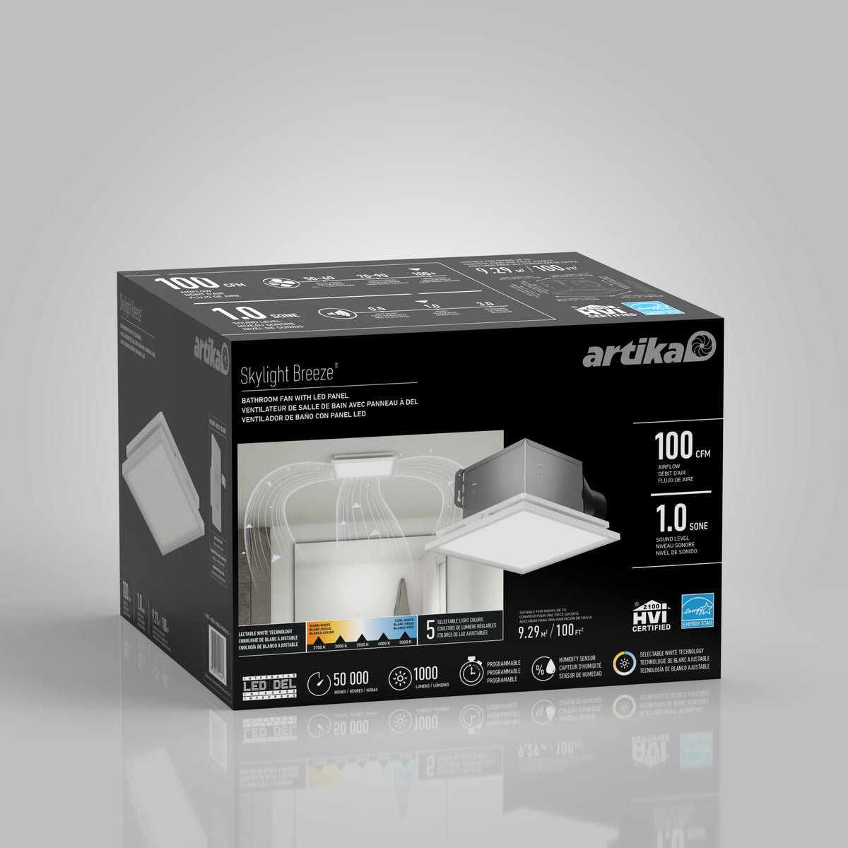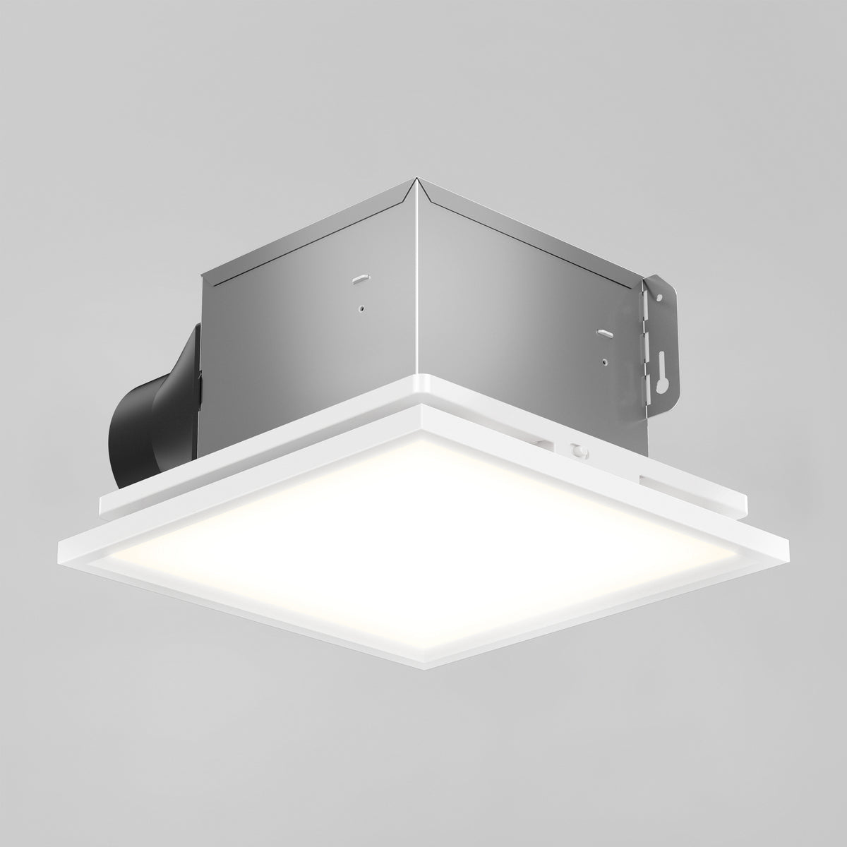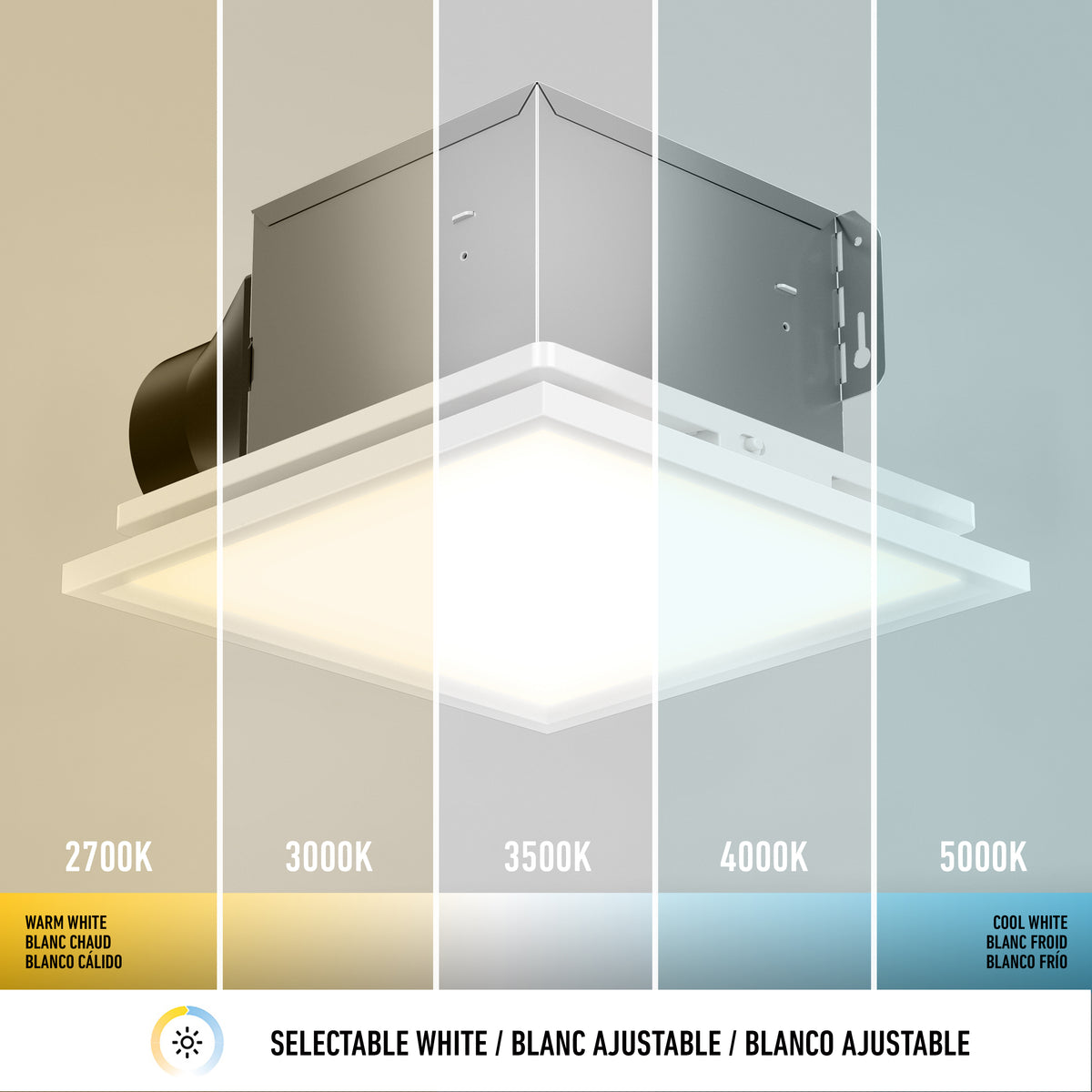 Moderne et passe-partout, ce ventilateur de salle de bain prend des airs de plafonnier avec son large panneau carré à DEL intégrée. Il aura fière allure dans toutes les salles de bains, alors qu’il aspire l’air par les côtés. Fini, les grillages disgracieux! Convenant aux grands espaces de 100 pi2 maximum (9,29 m2), ce ventilateur programmable est aussi puissant que silencieux. Son interrupteur mural inclus est muni d’un capteur d’humidité et d’un minuteur. Son luminaire ultramince possède une puissance de 1000 lumens et propose 5 teintes de blanc différentes, de la plus chaude à la plus froide. Durée de vie : 50 000 heures.